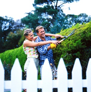 "Looking good, Honey. Don't stay up on that ladder for too long pruning or your beer will get flat."