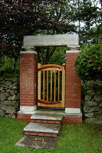 “A cottage, a field, a plow.”  The inscription makes me think of Scottish crofters, the small, self-sufficient farmers who were driven off their land by the English during the Highland Clearances.  The sequence of three singular nouns has a nice rhythm — ba-dum, ba-dum, ba-dum — iambs I believe.  The language complements the simple, home-spun wooden gate.  Gorgeous.  The whole vignette — the gate, the poetry, the sense of anticipation created for the visitor — is certainly reminiscent of the thresholds in ancient Chinese scholar gardens.  See: