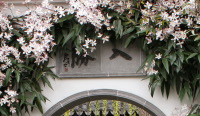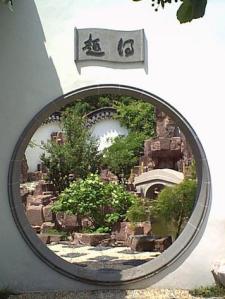 The inscription over this moongate says "Read the painting; Listen to the fragrance."