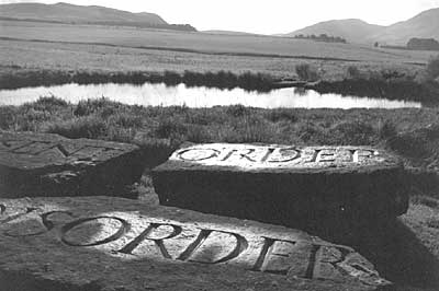 Of course, there is Ian Hamilton Finlay.  This Scottish poet and sculptor, who passed away in 2006, mixed up language and landscape in a most intriguing way.  On an abandoned farm in the hills near Edinburgh, Finlay created a landscape infused with language.  A visitor to this landscape — which Finlay named Little Sparta — will encounter words and phrases at every turn.  The inscriptions appear in all manner of objects: rocks, plaques, urns, bridges, statuary, etc. and may be subtle or (as in the photo below) quite assertive.