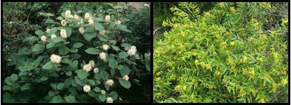 Fothergilla major surrounded by a ‘hedge’ of Shrubby St. John’s Wort (Hypericum prolificum).