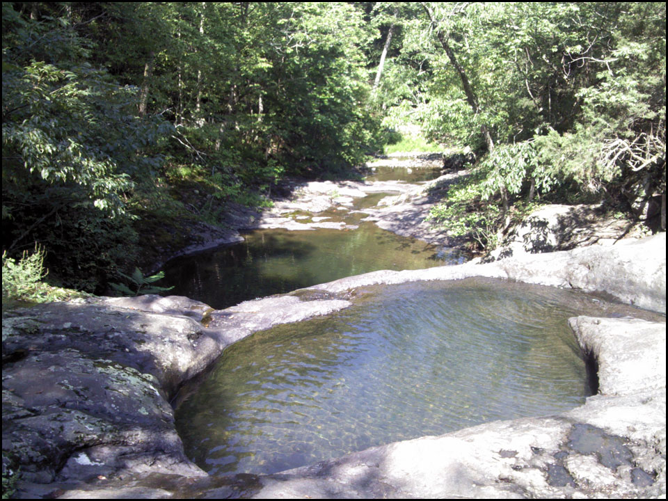 Perchance, had I stumbled upon a Spray CliffI invoked Level 3 of Bloom’s Taxonomy and applied the knowledge I had gleaned from my field guide to my surroundings.  Most of the plant life around the pools consisted of slippery algae on the surface of the rocks, some unidentifiable (by me) saplings, ferns, and a smattering of poison ivy.  There was no sign of any Mountain Laurel or Rosebay Rhododendron, the species that are supposed to be “locally abundant” in a Spray Cliff.  There were some lichens, but there were supposed to be liverworts.  Dang!