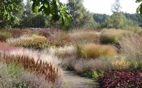 For a Principles of Design class, I traced over this image multiple times — once to show line, once for value, once for texture, etc.  In doing so, I became smitten with this landscape (Pensthorpe in Norfolk, England) and with its creator.  My mistake was in thinking that I could replicate such a landscape in my own shady (key word there – SHADY) backyard.  It took me a few years to accept that I would never have Sunlight Illuminating Glorious Sweeps of Grasses in my garden.  Luckily there are other beautiful arrangements of plants (Weak Sunlight Illuminating Dry Shade Groundcovers???), although violins still play a bittersweet tune in my head whenever I look at this image.