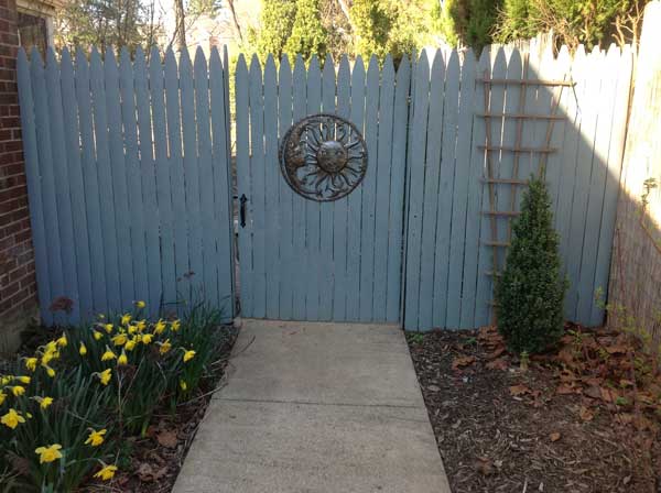Not bad. The metal sun and moon I attached to the gate was a purchase from a vendor at this year’s Philly Flower show. It was created from an old oil drum by Haitian craftsmen with a hammer and nail. Pretty cool!