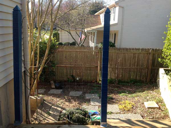 I made it completely out of stuff I found in my shed (I’m so sustainable!) except for the paint. I’m proud of my bold color choice, but I have to say that the metal fencing between the posts is not too attractive, is it? I am hoping an aggressive clematis will cover it up in one or two seasons, otherwise I will have to think of something else.