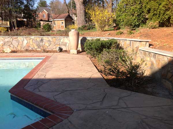 This wall is cinderblock, with stone facing. I also looked into brick and those decorative concrete blocks by Techobloc and Belgard, but the wall I wound up with cost less than half of the estimates I got for using those materials. Anyway, I am pleased with the color of the stone they used, because the rusty color matches the natural stones I find in my yard. I wish a nice thick capstone had been in my budget, but c’est la vie. (Oh look, I do know French!)