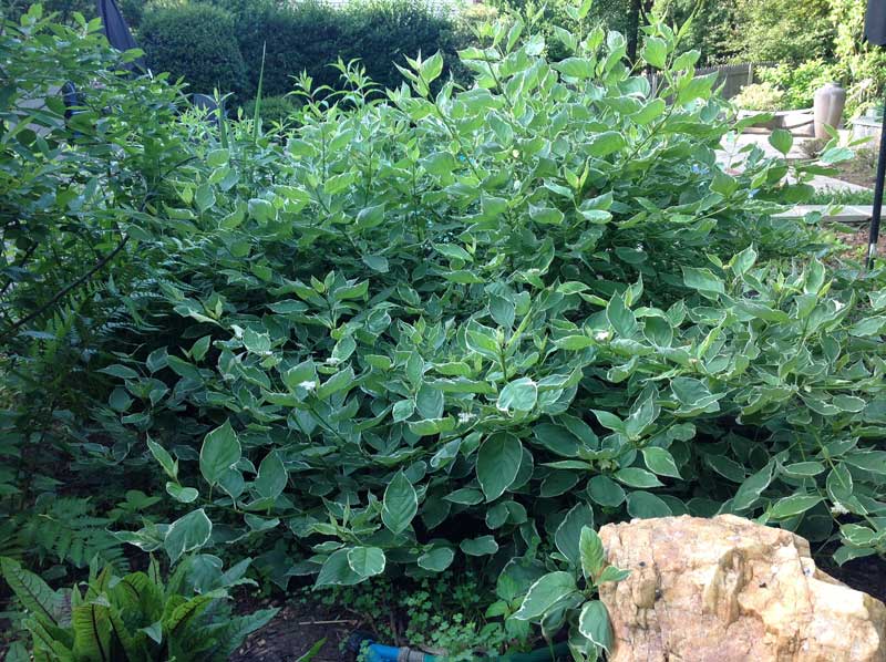 This Cornus sericea ‘Silver and Gold’ has spread quickly but hasn’t gotten too tall. And it has wonderful bright yellow stems in winter: