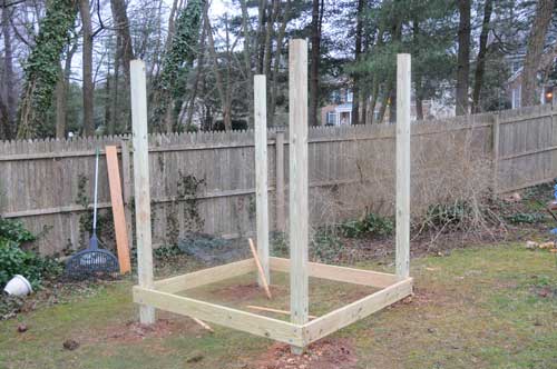 Hey there! Check out my latest off-season project — a sort of double-decker birdwatching platform/playfort thingee, tucked in the far corner of my backyard. According to the various building plans I have consulted, a project like this should be do-able in a weekend! Ha-ha! (They should list alternate time estimates for the out-of-shape and/or clueless). This is where I am so far, after about 10 hours worth of work (with one 6-yr-old helper):