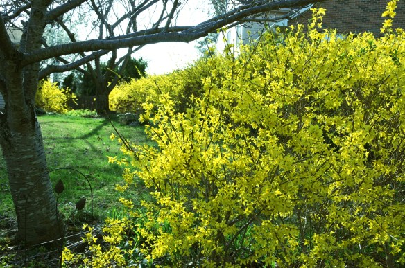 If you live in zone 7, it’s just popped out in all its tacky gold glory, and is either splaying all over the place in a spectacular tangle or — more likely — it was sheared into a giant egg shape in the fall by some doofus (possibly your spouse) so now it can’t fully express its brazen forsythiosity.